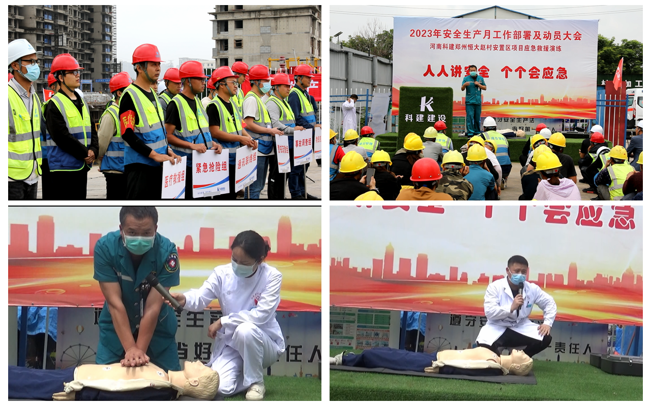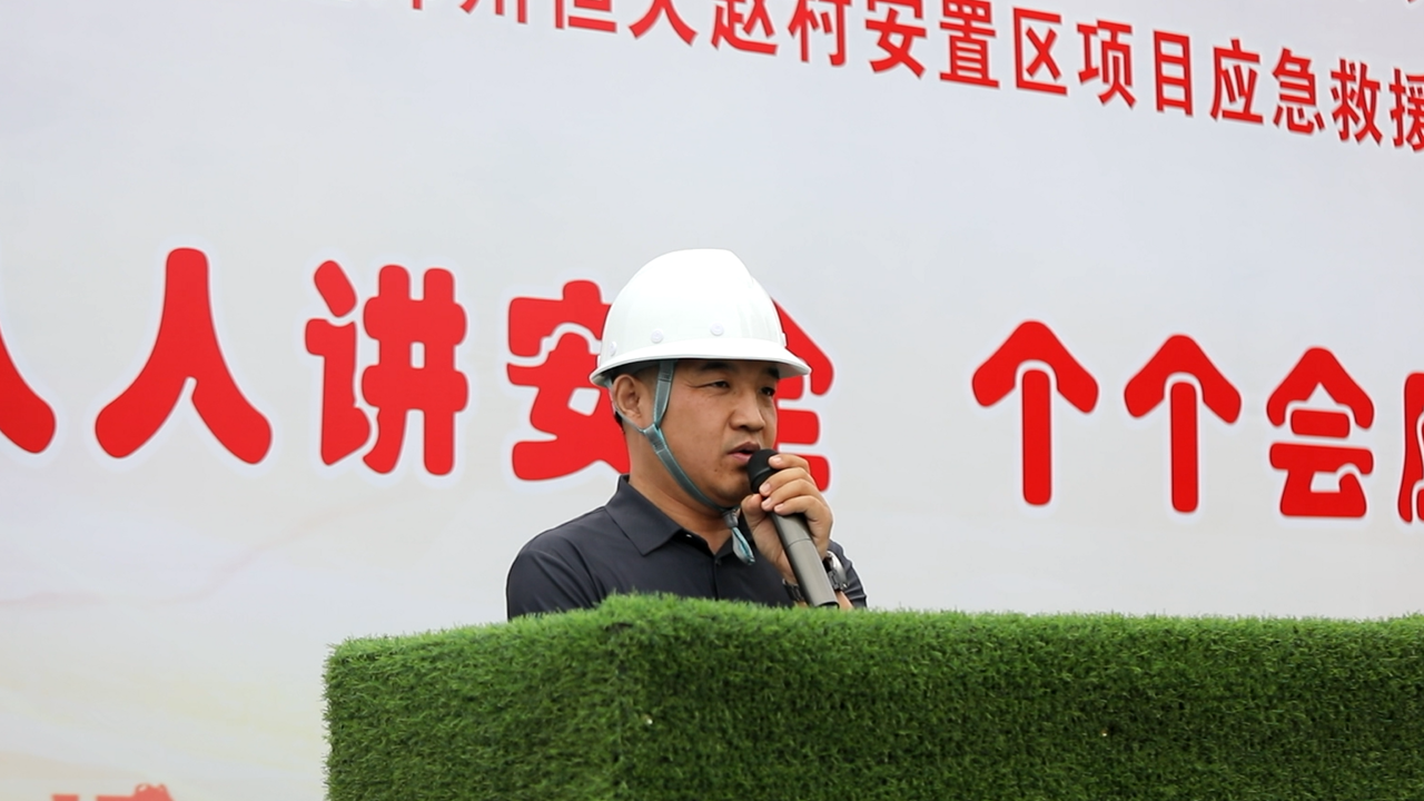 2023530日上午10:00,以“人人讲安全,个个会应急”为主题的2023年“安全生产月”动员大会暨高处作业专项应急演练活动在恒大赵村安置区项目召开,建设单位工程部经理郑志成、万安工程咨询有限公司监理代表、公司董事兼副总经理马西锋、公司副总经理齐含钊、公司副总经理孙全明、恒大赵村安置区项目经理史伟、公司工程部、技术部及公司所属各项目生产经理、技术负责人、安全主管,恒大赵村安置区施工现场作业人员共计200余人参加,姬涛主持活动。